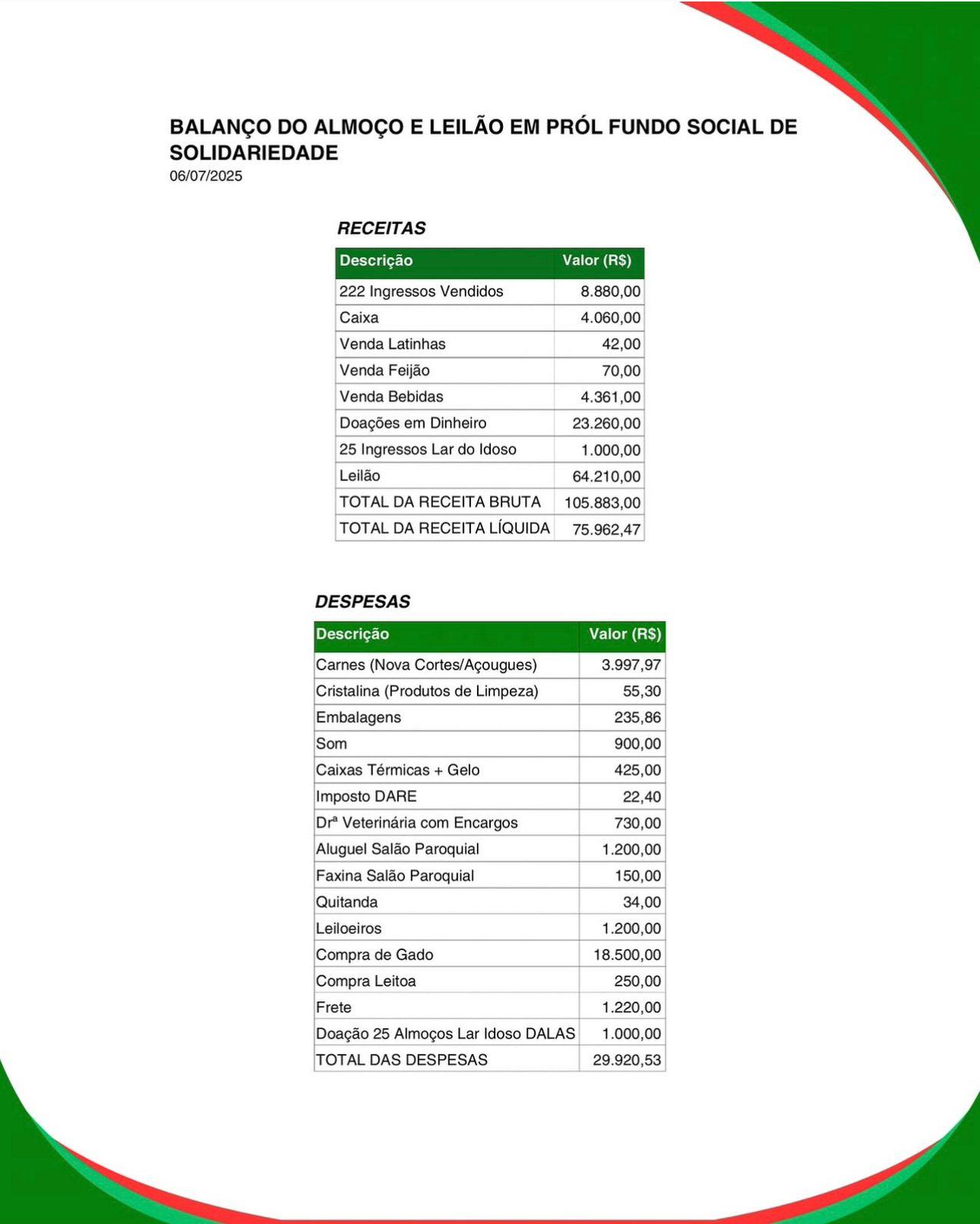 Hoje, mantendo a transparência, divulgamos o balanço detalhado do evento. Foram arrecadados R$ 75.962,47, que serão totalmente destinados a ações que levam dignidade, assistência e esperança às famílias em situação de vulnerabilidade no nosso município.